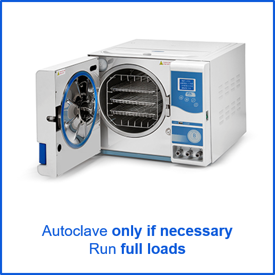 Run full loads (autoclave, dishwasher) only, use water-efficient models, and implement proper maintenance schedules to reduce water consumption per cycle.